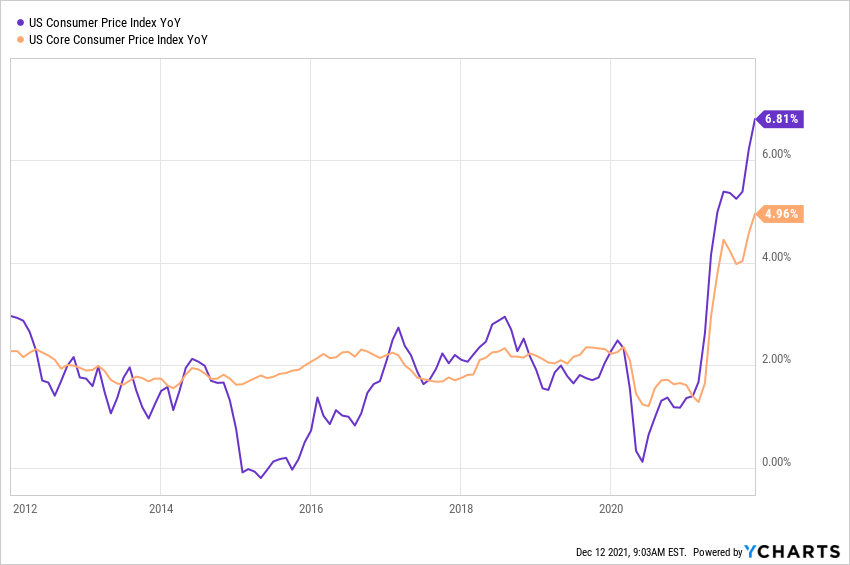 Unfortunately, with today's news (12/10) that the Consumer Price Index rose 0.8% in November (an annualized rate of 9.6%!) and 6.8% for the latest twelve months, it becomes increasingly difficult to believe inflation is transitory. The core CPI (excluding food and energy), rose at a slower 4.9% pace for the latest twelve months, but that is still a 30-year high.