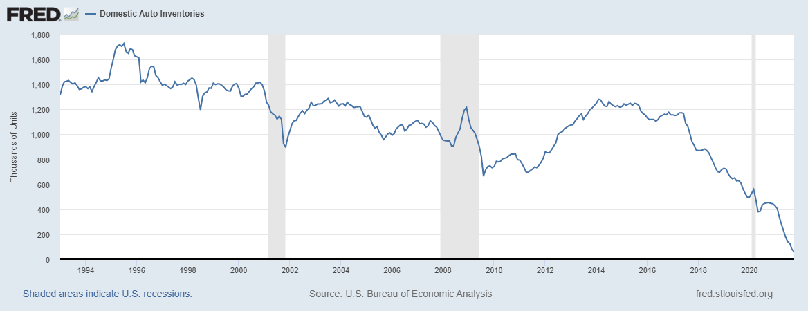 There is no better illustration of the impact the nation's supply-chain fiasco is having on our economy than this graph of auto inventories: