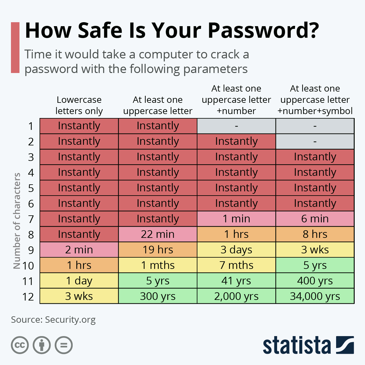 Since we use our computers to manage our finances, secure passwords are vitally important to protect our assets. I came across this chart from Statista which gives you an idea of how difficult it is to crack a password of various lengths and character types. A password of twelve characters including capital and lowercase letters, a couple of numbers, and a symbol or two offers almost impenetrable security from a brute force attack on your account. Of course, if your password is stolen, it becomes useless no matter how long and complicated. So change your passwords occasionally and never use the same password on more than one account as it increases your vulnerability should one of your passwords ever get stolen.
