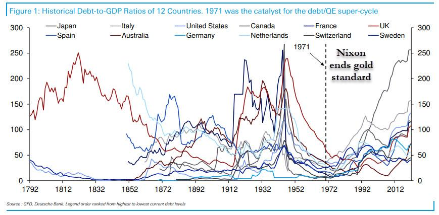 Below is a chart from Deutsche Bank showing the dramatic rise in debt-to-GDP ratios since we ended the gold standard. With many nations running debt-to-GDP ratios of more than 100% and trending higher, I wonder if we're in a better place now, monetarily speaking, than prior to 1971. Yes, there were spikes in the ratio because of the two world wars, but the gold standard forced discipline on governments to reduce their debt levels when the crises were over. Since 1971, there has been little evidence of that kind of discipline (and none in Washington DC these days!).