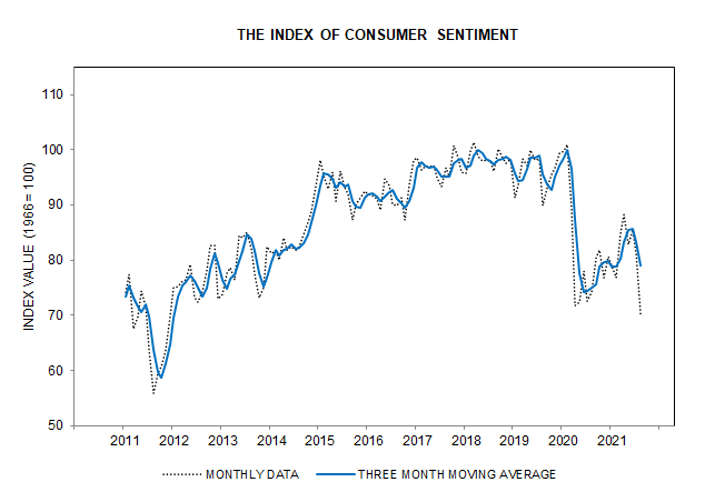 There appears to be a disconnect between Wall St. and Main St. According to the University of Michigan, consumer sentiment fell sharply in the first half of August below the pandemic lows last year. So much for all-time highs!