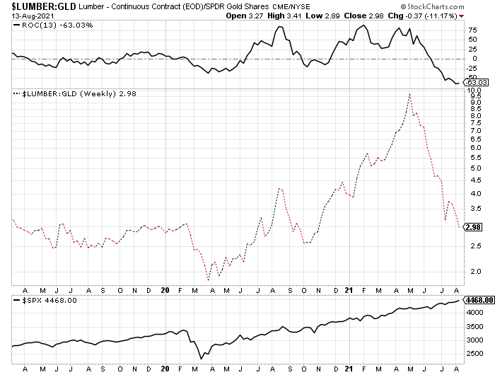 Lumber prices continue to fall with the futures contract now at $492 down from a high this Spring of $1,734! That's good news for home builders and buyers. However, this decline does raise a yellow flag when it comes to my lumber/gold indicator: