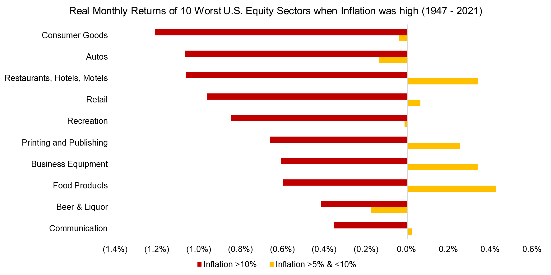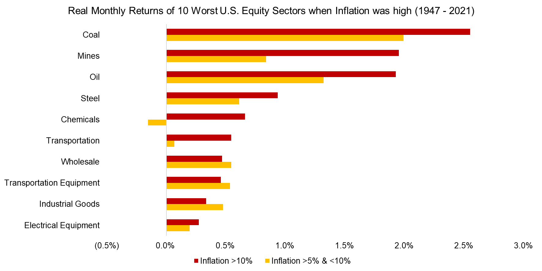 I came across two charts (among several interesting ones) from Factor Research which show the real (after inflation) returns from stocks grouped by industry under two different inflation regimes, 5-10% (where we are today?) and greater than 10% (where we're heading?).
