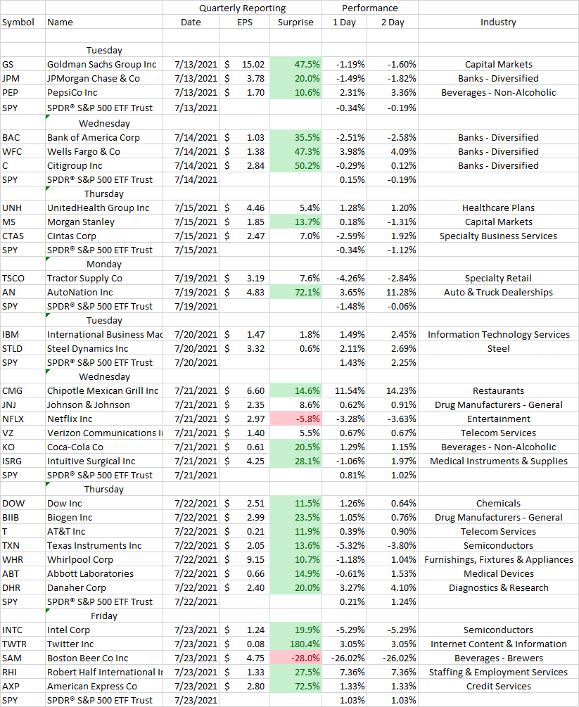 Highlighted in green are reports that significantly (>10%) exceeded estimates. In red are those that missed estimates. A couple of observations: First, there are a lot of greens and very few reds (Boston Beer being the most notable) which speaks to the strength of the economy's recovery (and/or a lot of pessimistic analysts). Second, although banks uniformly beat estimates, they performed poorly (worse than the S&P 500) in the days subsequent to their reports. Third, two leading tech stocks, Texas Instruments and Intel performed poorly despite positive results. We'll get a better read on the tech sector next week when many of the largest tech companies report. Lastly, Netflix disappointed investors suggesting the boom in stay-at-home stocks may be drawing to a close.