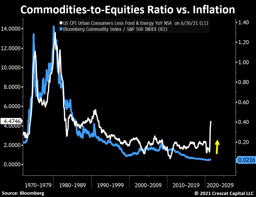 The chart suggests there is a fairly tight correlation between inflation and the relative price of commodities. Does the recent jump in CPI suggest a change in the relative price of commodities after a 40-year decline? Sure seems plausible.