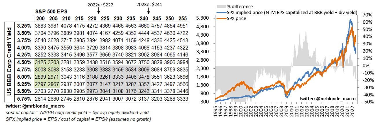 Interesting table of price targets based upon corporate bond yields. Look at the green shaded section for worst-case scenarios and the gray shaded area for a more optimistic forecast of where stocks may bottom.