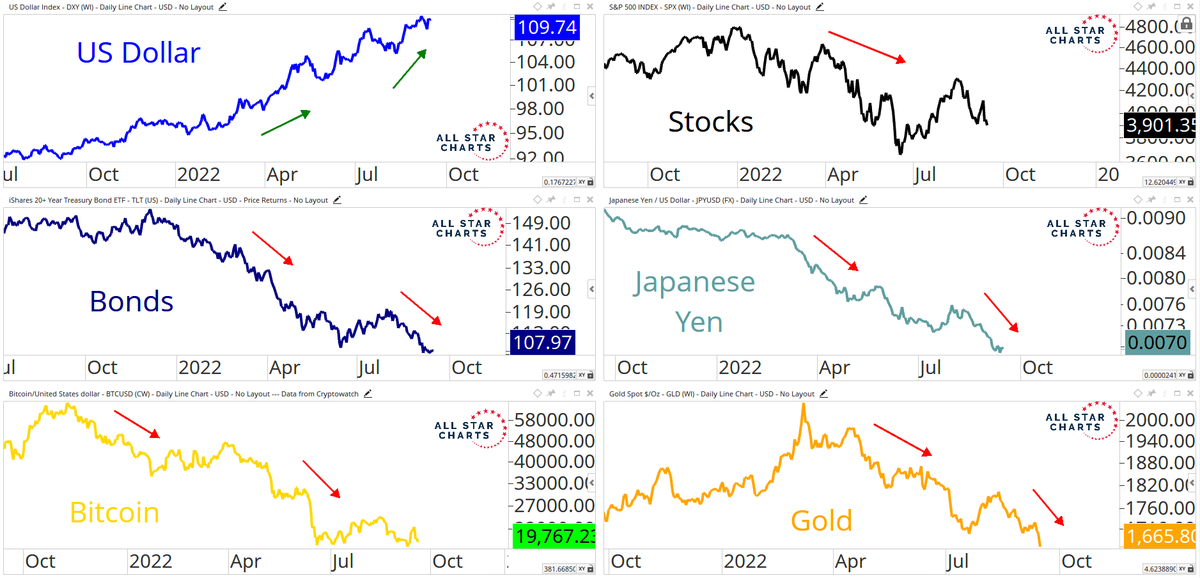 Interesting charts seem to implicate a rising dollar for falls in stocks, bonds, gold, etc.