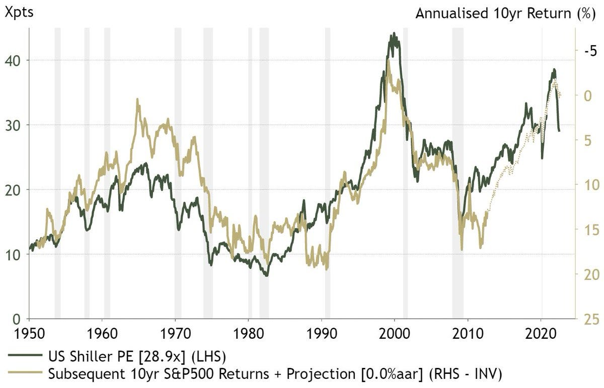 Valuations are still high as this graph of the Shiller P/E shows. (And it suggests returns for stocks could be zero over the next ten years.)