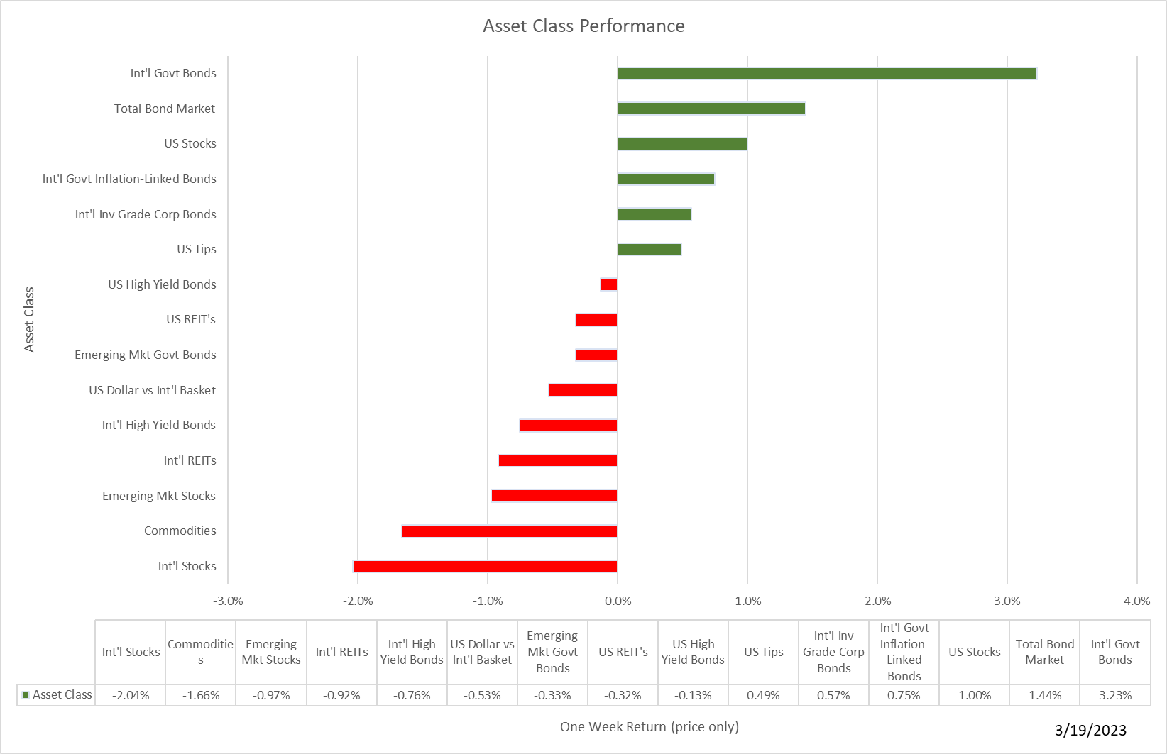 Last week could have been worse. Bonds were helped by expectations of at least a moderation of the Fed's interest rate increase and a flight to safety. U.S. stocks did ok as well, helped by some decent earnings reports from the few companies left to report and relief that the SVB debacle appeared to be contained.