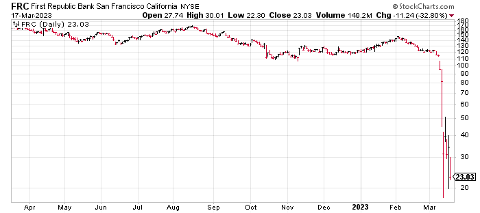 And First Republic Bank, despite receiving $30 billion in deposits from a consortium of major banks, fell to a new low of $23.03 from a high of $169.39 in August, an 86% decline.