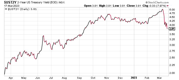 Not surprisingly, interest rates fell sharply as panicky investors fled stocks and opportunists bet on Fed rate cuts to stabilize the banking system. Here for example is the yield on 2-year US Treasury bonds. After breaking above 5% on March 8, by the end of last week, the rate on a 2-year bond was 3.81%.