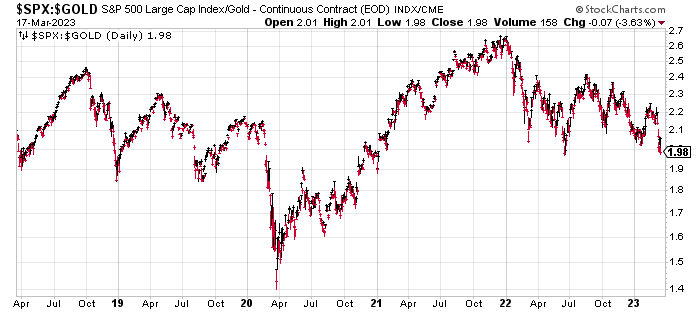 Here is a chart of the relative performance of stocks vs. gold. Remember, a rising trend means stocks are doing better than gold while a falling trend means gold is doing better than stocks. Clearly, gold has been the champ since the start of 2022 and given all the uncertainty in global financial markets, I wouldn't be surprised to see the current trend continue for a while. By the way, the long-term average of stocks/gold is 1.6 so it looks like stocks remain expensive versus gold.