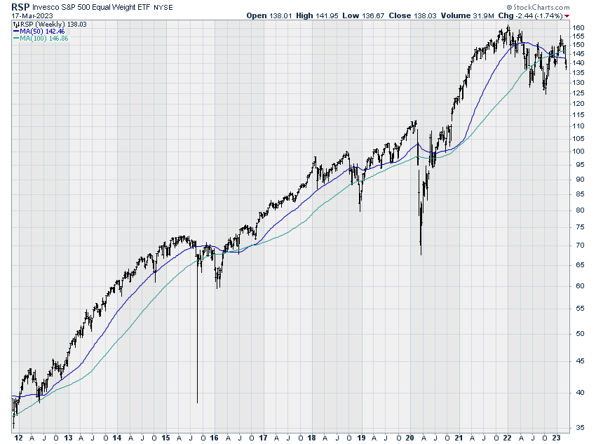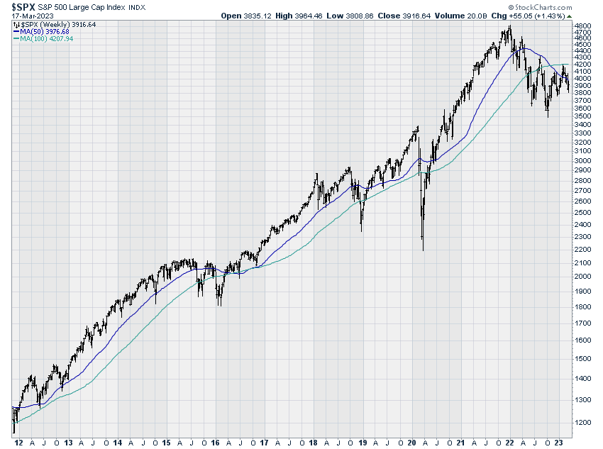 Unfortunately, the turmoil of the past couple of weeks has reversed the improving momentum trends we had seen at the end of February. Here, for example, is the weekly chart of the S&P 500, now trading below the 50 and 100-week moving averages (not good).