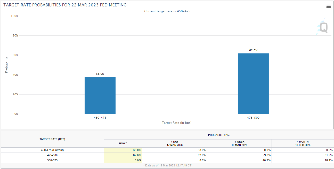If inflation is cooling a bit and the Fed is dealing with a banking panic, will we get a pause or a moderation of the rate hikes at the Fed meeting on 3/22? Perhaps. As of Friday, futures markets were projecting a 38% chance of a pause and a 62% chance of a 25 basis point hike. It looks like a 50 basis point increase is off the table.