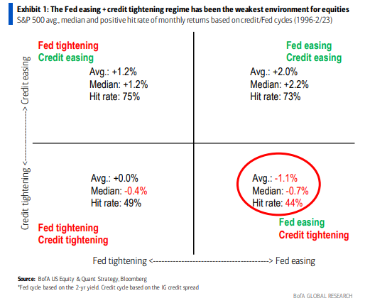 Why does this matter? According to research from Bank of America, the worst environment for stocks is when the Fed is easing while credit is tightening.