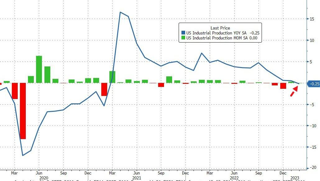 Let's finish with a couple of charts on the economy. First off is industrial production which has slid into negative territory (year-over-year).