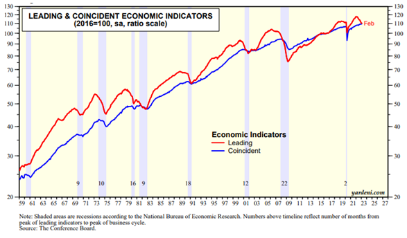 Next up, leading and coincident indicators from The Conference Board. The index of leading economic indicators fell 0.3% in February for the 11th decline in a row continuing to signal an upcoming recession. However, there is no sign of recession in the index of coincident economic indicators.