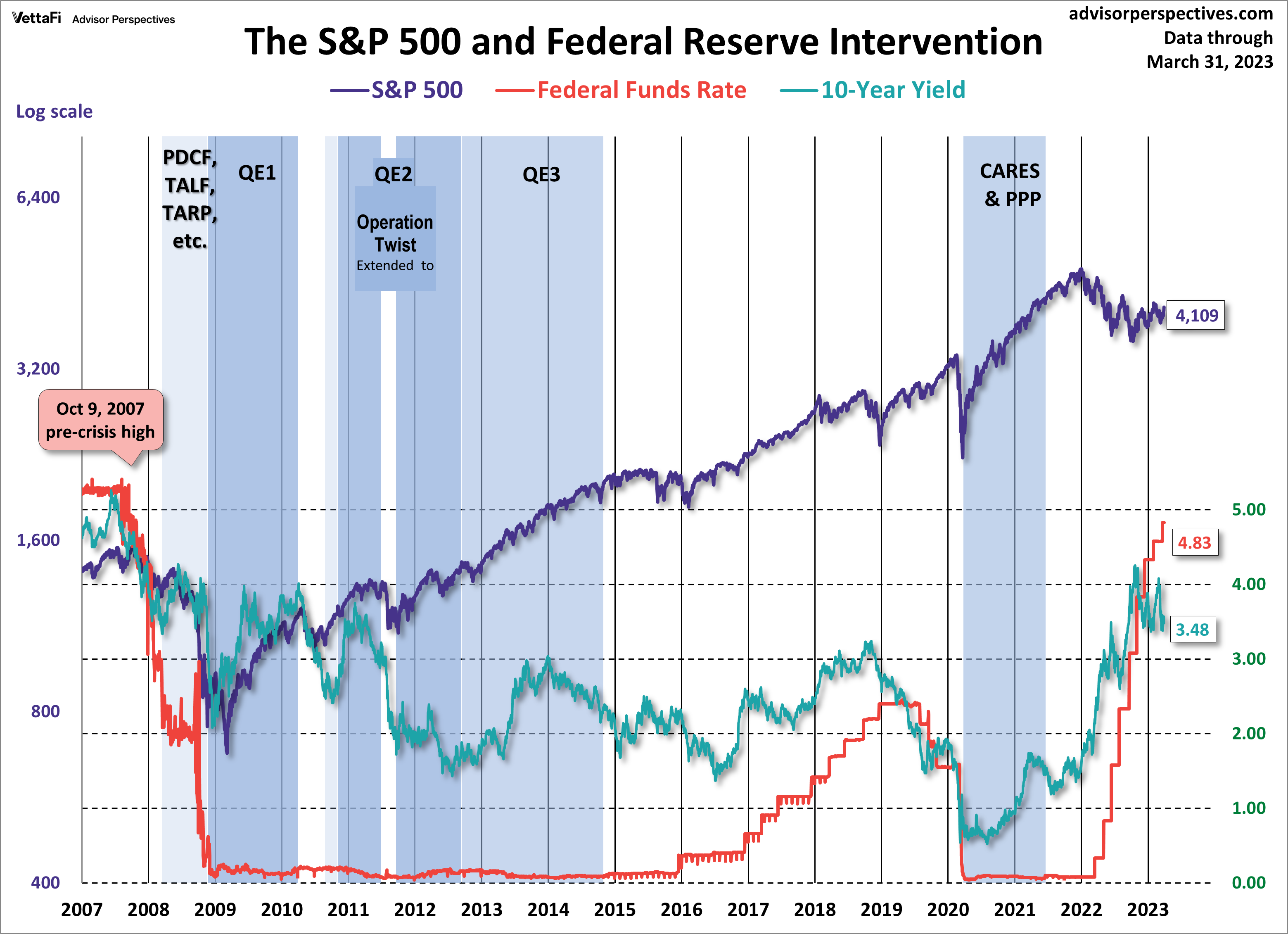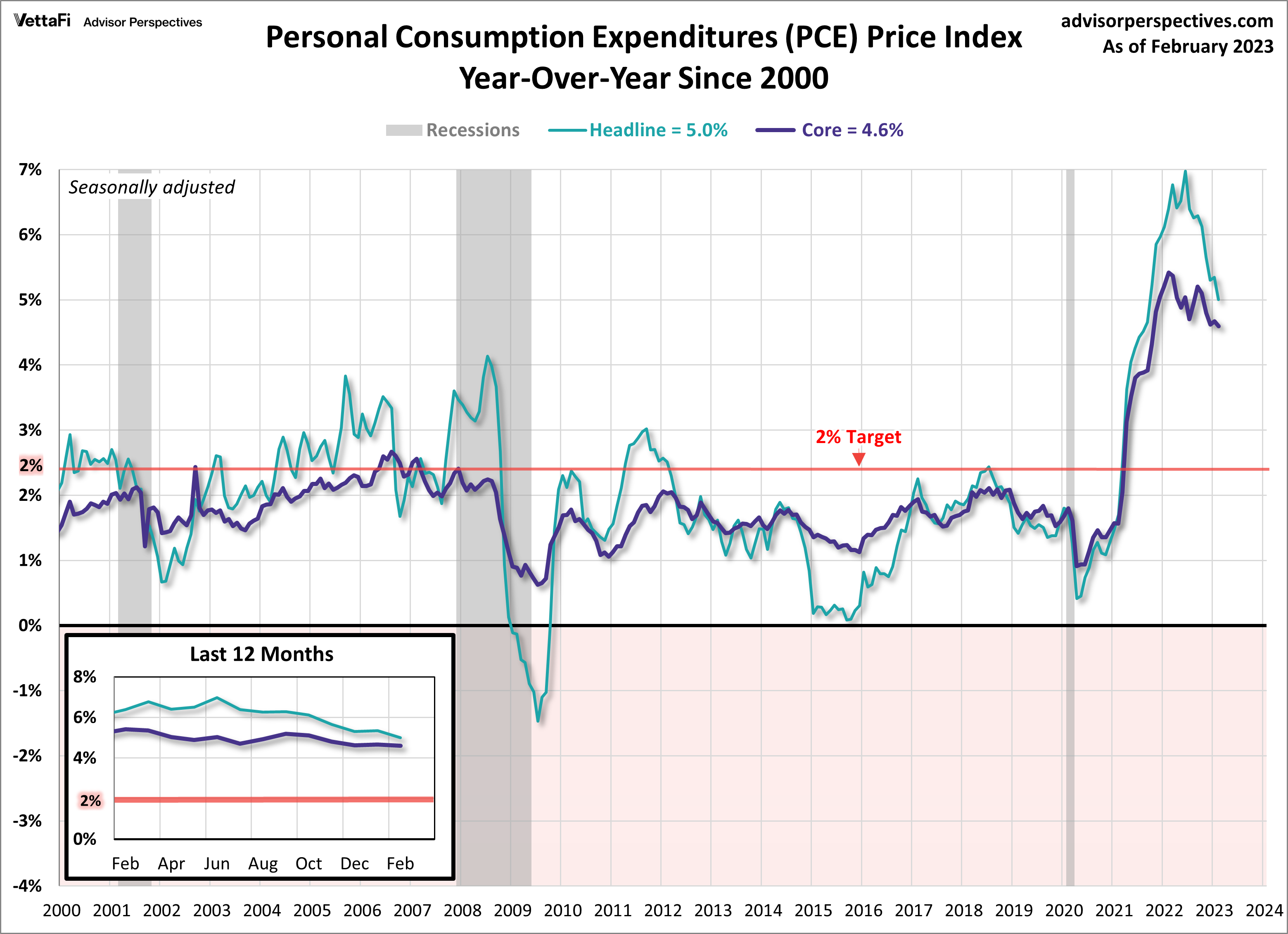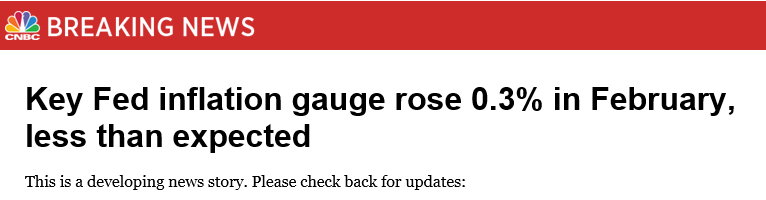 This is the chart of the headline and core index through February. While it's still higher than the Fed's target, the softening of the index may give them room to pause rate hikes...