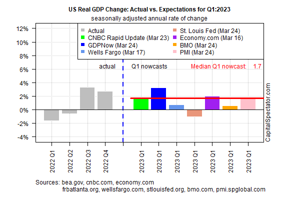 Looks like GDP will be up again in the first quarter of 2023, albeit growing slower than last quarter. Here's a summary of recent forecasts: