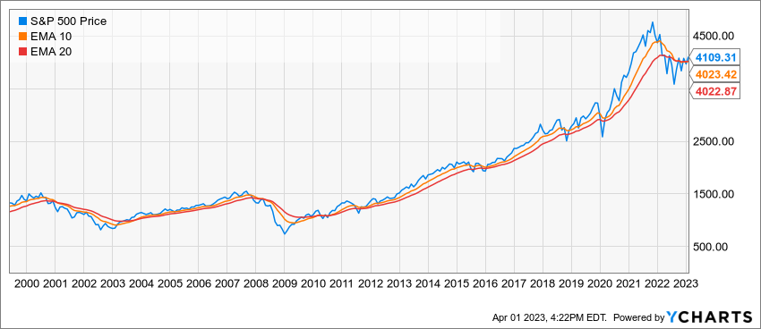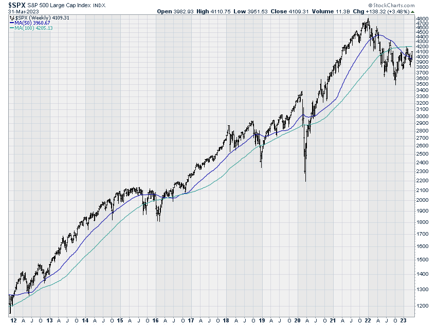 Thanks to a strong March, the S&P 500 has now traded above (albeit, just above) our favorite long-term momentum indicators for two months in a row, suggesting the 2022 bear market is drawing to a close. Here's the chart: