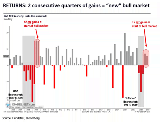 Still a skeptic? Perhaps this will convince you. (Personally, I think there are some problems with this analysis - limited data and the last bull market had four consecutive up-quarters to get started, not two - but hey, it's a start.)