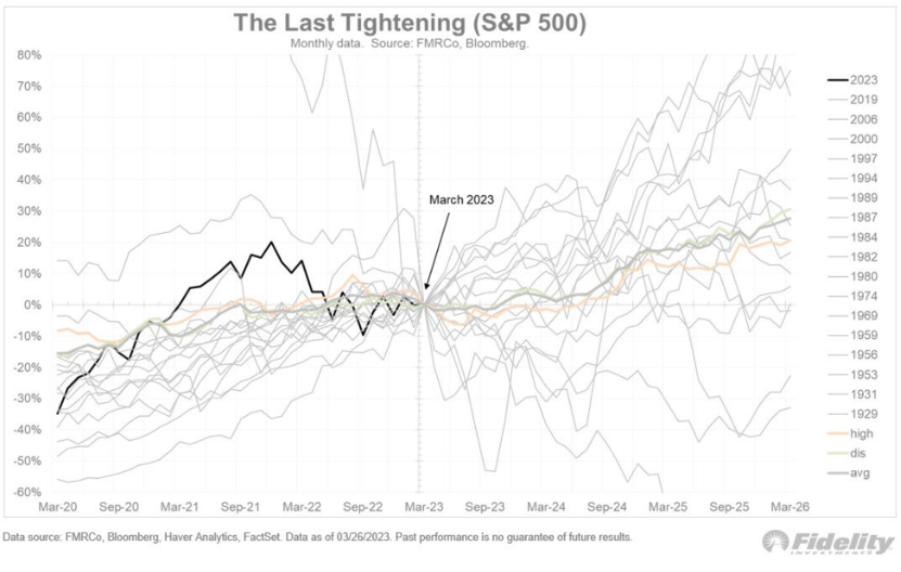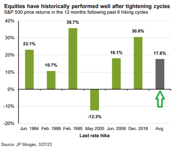 Suppose the Fed finished raising rates at the March meeting. What happens next for stocks? Looks like they are more up than down...