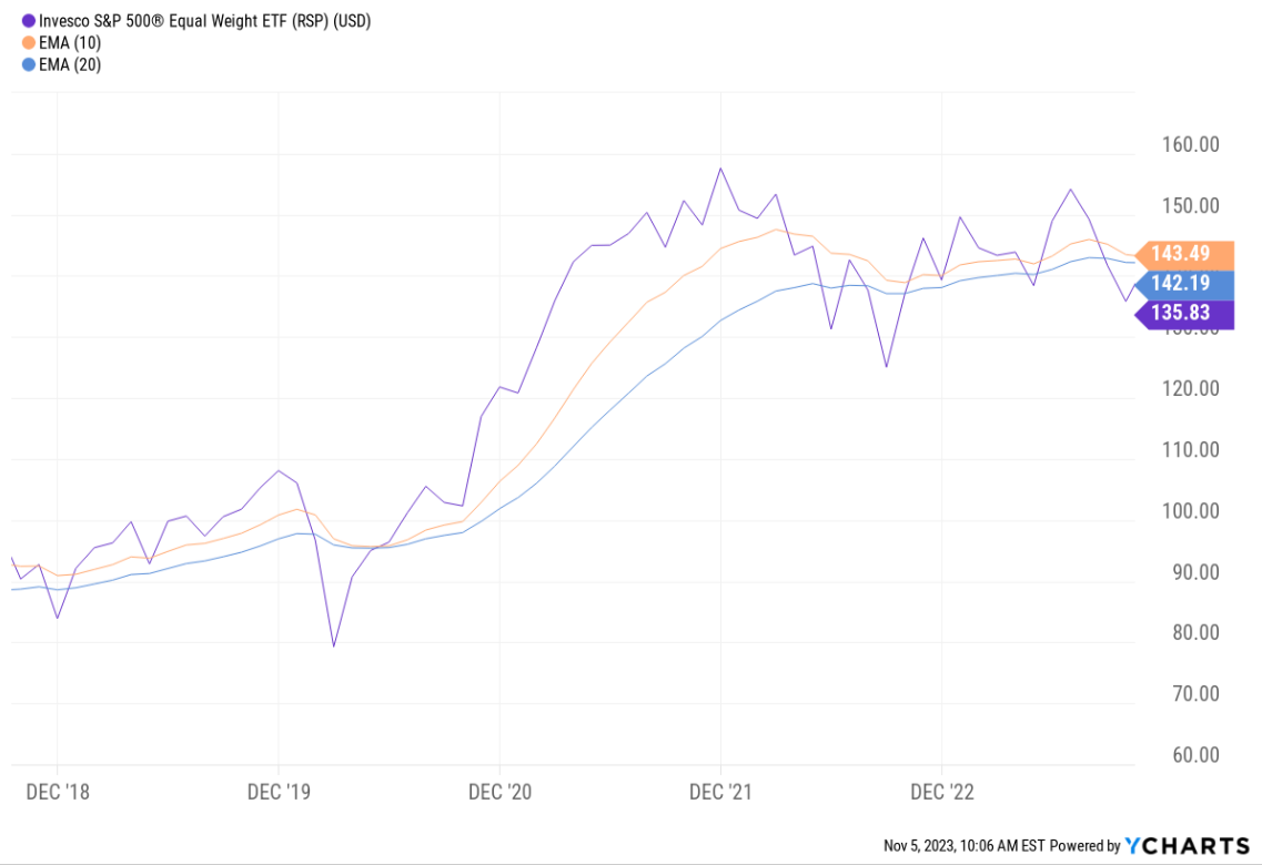 In fact, on an equal-weighted basis (RSP), the moving averages were indicating bear market potential.
