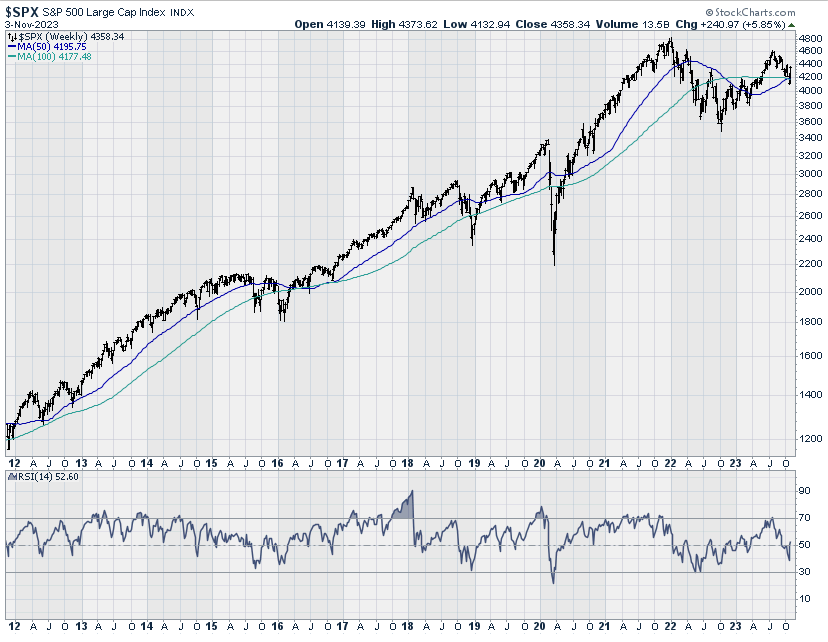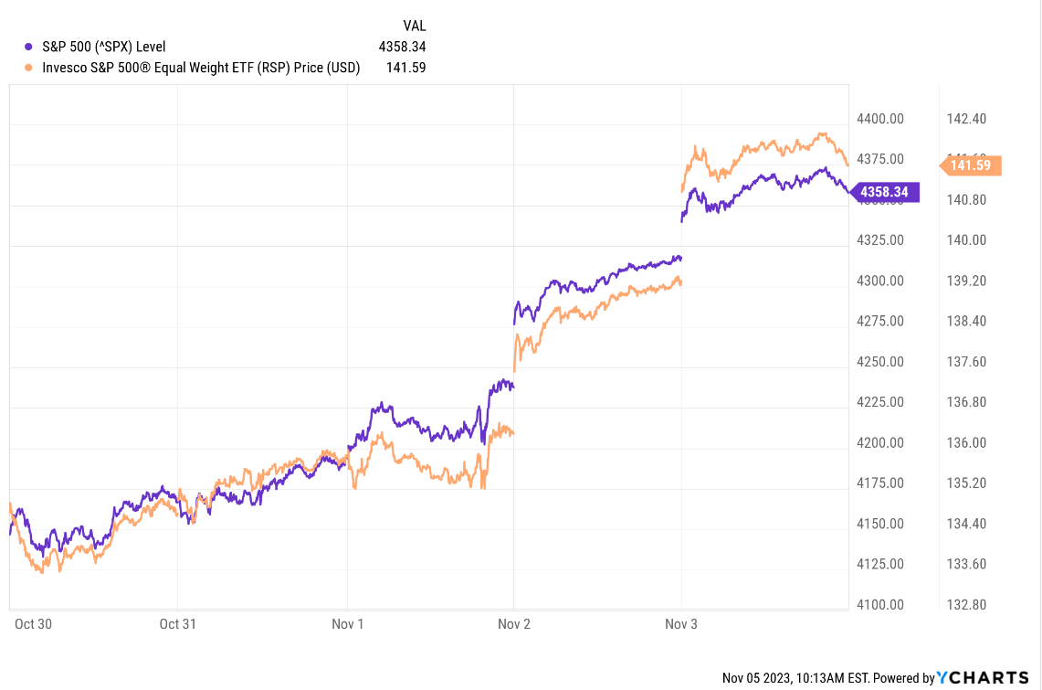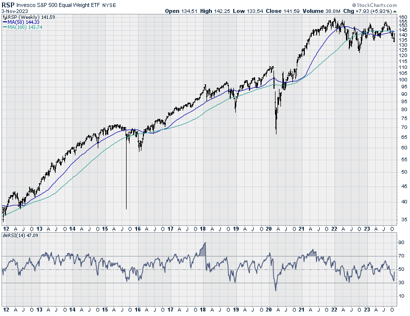 The 5%+ surge in stock prices in the first few days of November has at least temporarily eased my concerns. The S&P 500 is now trading above both moving averages. Unfortunately, RSP, despite its strong rally, is still below its moving averages, suggesting some caution is still warranted.