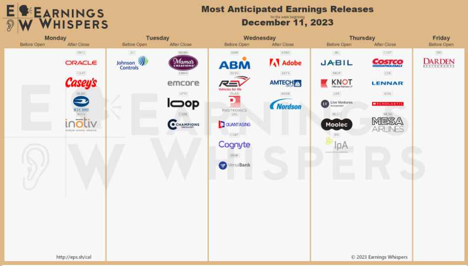 Several companies are reporting quarterly results this week. Three I'm keeping an eye on are Oracle, Adobe, and Costco. Costco, in particular, should give us a good read on the consumer as the year draws to a close.