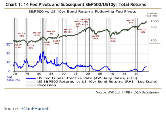 This chart maps the path of stocks vs bonds when the Fed pivoted to rate cuts. Typically it sends the stock/bond ratio lower, conceptually this makes sense: lower rates are good for bonds, and lower rates are often in response to weaker growth (bad for earnings, sentiment: stocks lower). From an asset allocation perspective if you believe the Fed will pivot to rate cuts then the historical probabilities favor underweighting stocks, overweighting bonds.