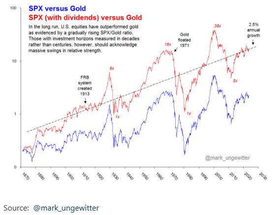 Gold has been on a roll lately. While I don't object to holding some gold in your portfolio as a crisis hedge, it is not a great long-term investment when compared to stocks. Specifically, when you include dividends, stocks are the hands-down winner despite periods of significant outperformance by gold.
