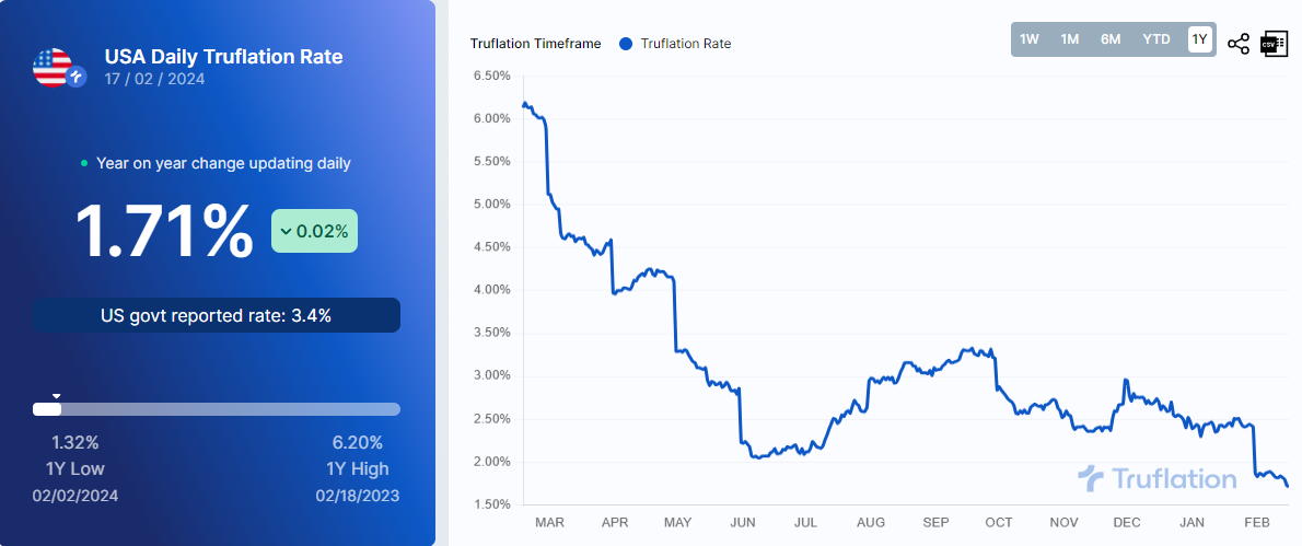 Truflation's daily inflation rate is 1.71%, while up from the start of February, is still about half the CPI.