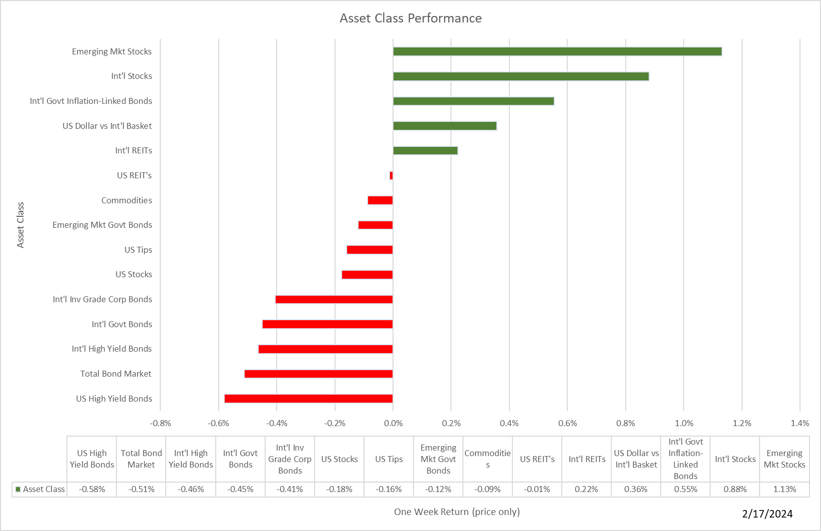 After posting 1%+ gains for five straight weeks, the S&P 500 took a step back, falling 0.4% last week. Bonds also took it on the chin. Here' the weekly look at asset class returns: