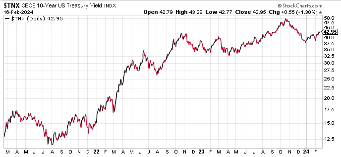 The bad inflation news coupled with no immediate signs of a slowdown has resulted in expectations of further delays in rate cuts. Indeed, rates on 10-year bonds have increased from 3.8% at year's end to 4.3% today.