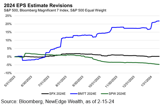While the last quarter is coming in better than expected, 2024 earnings forecasts for many companies have been falling (the green line).