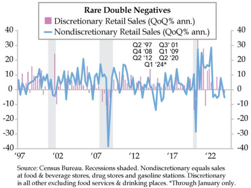 It's unusual to see both non-discretionary and discretionary retail sales both decline in a quarter. It usually happens during a recession. It's starting to happen in the first quarter of 2024. Something to watch...