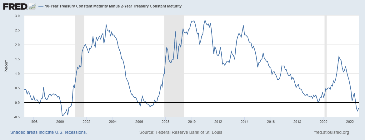 Another recession warning is an inverted yield curve. The 10-2 year U.S. treasury yield curve shown here has been negative for several weeks.