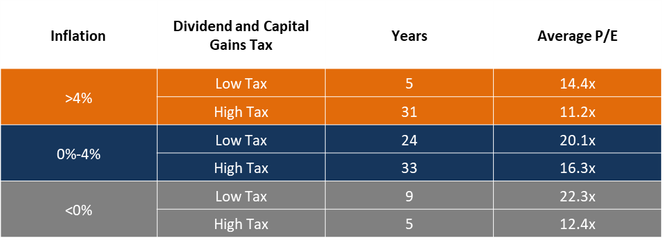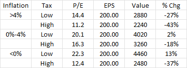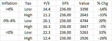 Remember this table? It shows various P/E ratios given inflation and tax environments experienced over the past 100+ years.