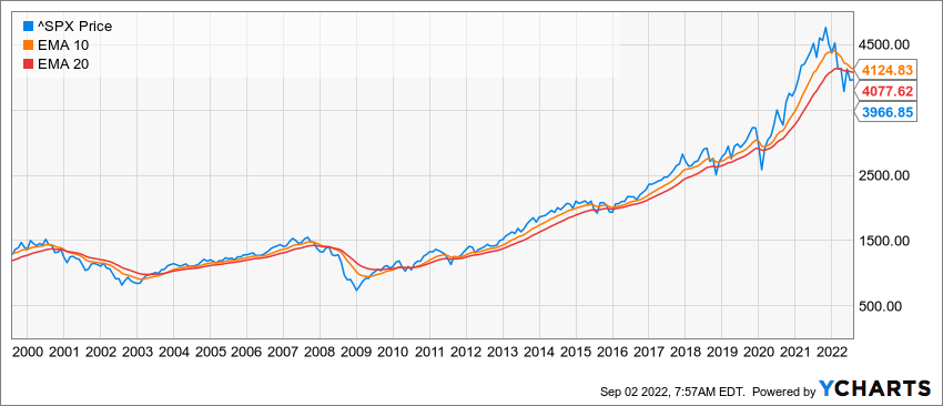 As of August 31, the S&P 500 is trading below our favorite long-term moving averages (specifically the 10 and 20-month exponential moving averages) and both moving averages are below their recent peaks. This suggests stocks are now in a downtrend which will likely persist until stocks begin to trade above those moving averages.