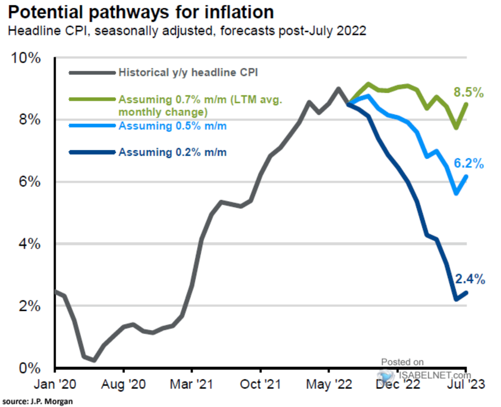 J.P. Morgan provides three different scenarios for inflation in this graph. Note that only very mild inflation going forward will get us close to the Fed's 2% target by mid-year 2023.
