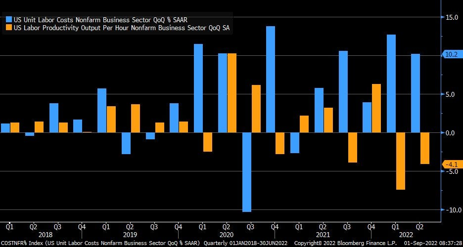 Here, for example, is a chart of unit labor costs and productivity. For the last two quarters, unit labor costs have risen at a 10%+ annual rate while productivity has fallen. In effect, companies are paying more to produce less. Unless passed on to consumers in the form of higher prices, profit margins will be squeezed.