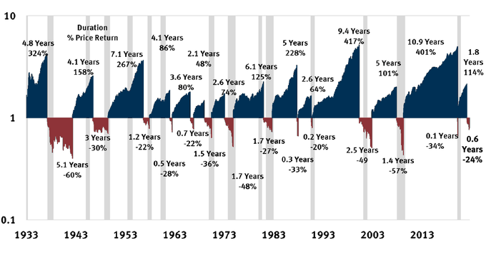 The 2022 bear market is now eight months old. The average bear market lasts about eleven months. Bear markets rarely last more than two years with the two longest, 9/7/1929 - 6/1/1932 and 3/24/2000 - 10/9/2002, lasting 998 and 929 days respectively. Bear market declines since 1929 have ranged from -86% ('29-'32) to -19% (several). Here's a graphical look at the data.