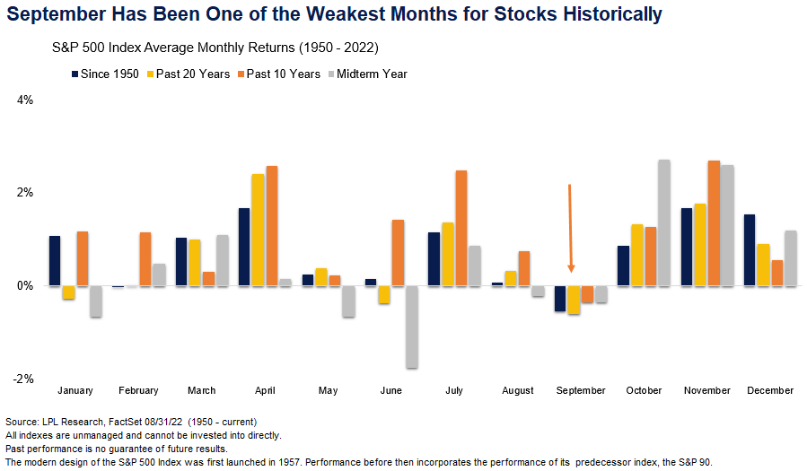For those of you hoping for a September rally to bail us out, I've got some bad news. September has historically been the worst month of the year for stocks. Here is a chart from LPL Research illustrating the phenomenon.