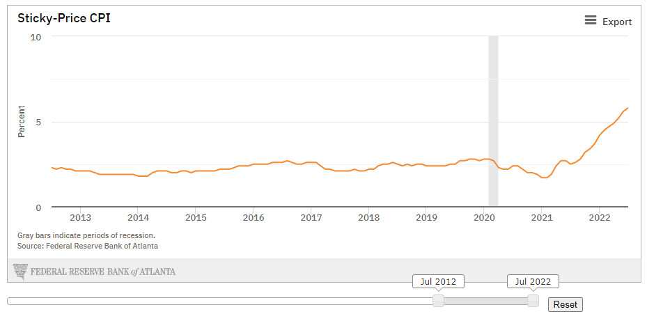 Inflation may be peaking but it's still high by historical standards and will likely remain above 5% into the next year. The Atlanta Fed maintains the "Sticky-Price" CPI representing a basket of goods and services whose prices are slow to move, up or down. As of July 2022, the Sticky-Price CPI stood at 5.8%.