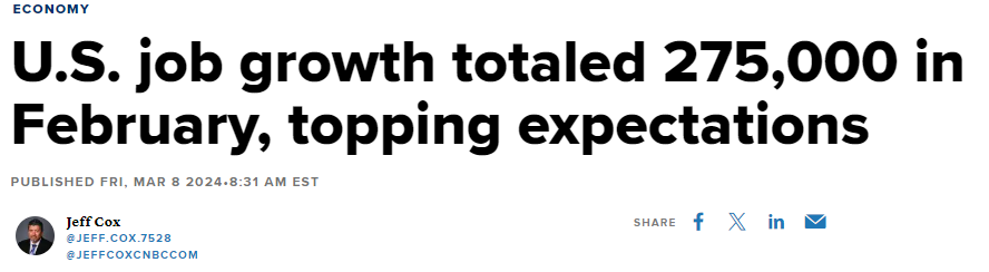 While not directly related to employment, Fed Chairman Powell, in prepared remarks for today's Congressional testimony stated that “The Committee does not expect that it will be appropriate to reduce the target range until it has gained greater confidence that inflation is moving sustainably toward 2 percent.”