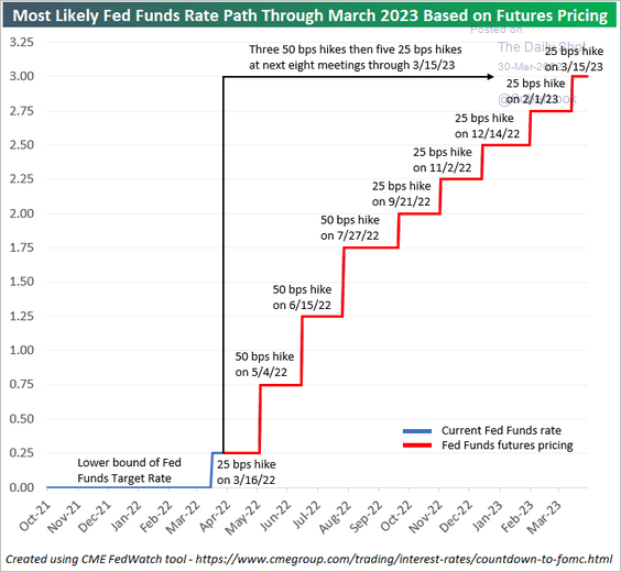 Subsequent to this announcement, Fed Chairman Powell indicated that the Fed may become more aggressive in addressing inflation which suggests the potential for larger or more frequent hikes in the near future. Here's one scenario based on the Fed Funds futures market: