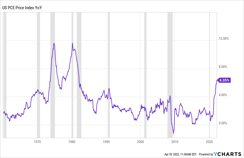The Bureau of Economic Analysis just released the Personal Consumption Expenditures (PCE) Price Index for February 2022. This index, supposedly the Fed's favorite measure of inflation, hit 6.4% in February (5.4% excluding food and energy). This marked its highest level in 40 years! Take a look: