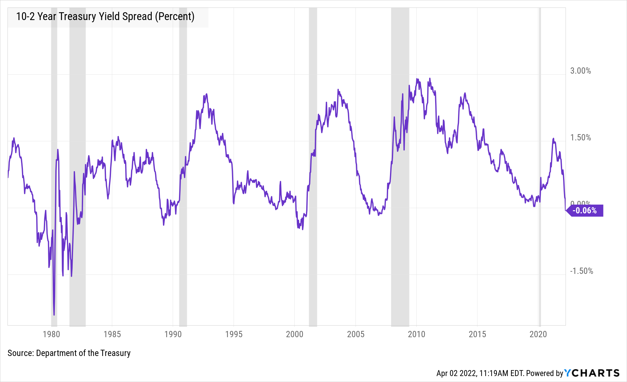 The difference between the yield of 10-year US Treasury bonds and 2-year bonds is usually a positive number. In other words, it costs more to borrow money for ten years than two under normal circumstances. However, when this difference turns negative, it suggests an economic downturn in our relatively near future. Well, as you can see on the graph below, the 10-2 yield spread just went negative on April 1 (no fooling!).