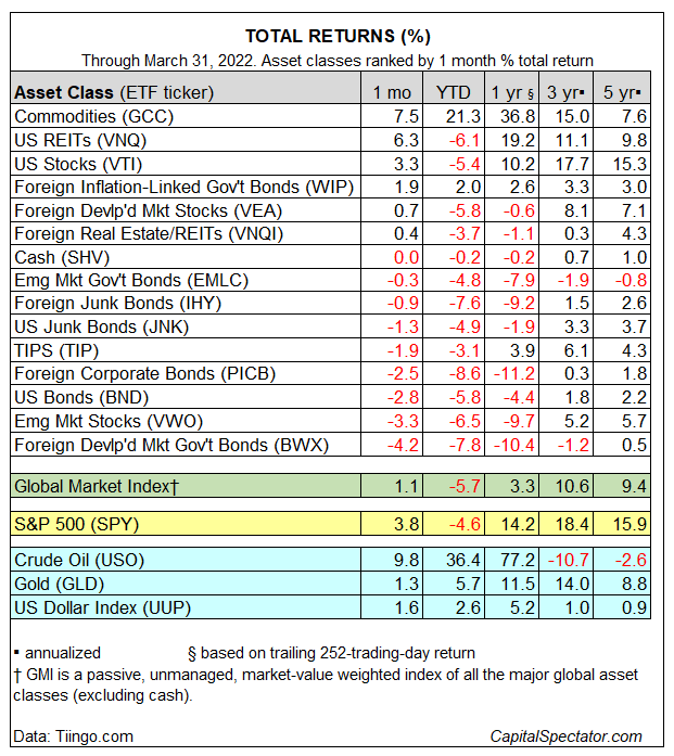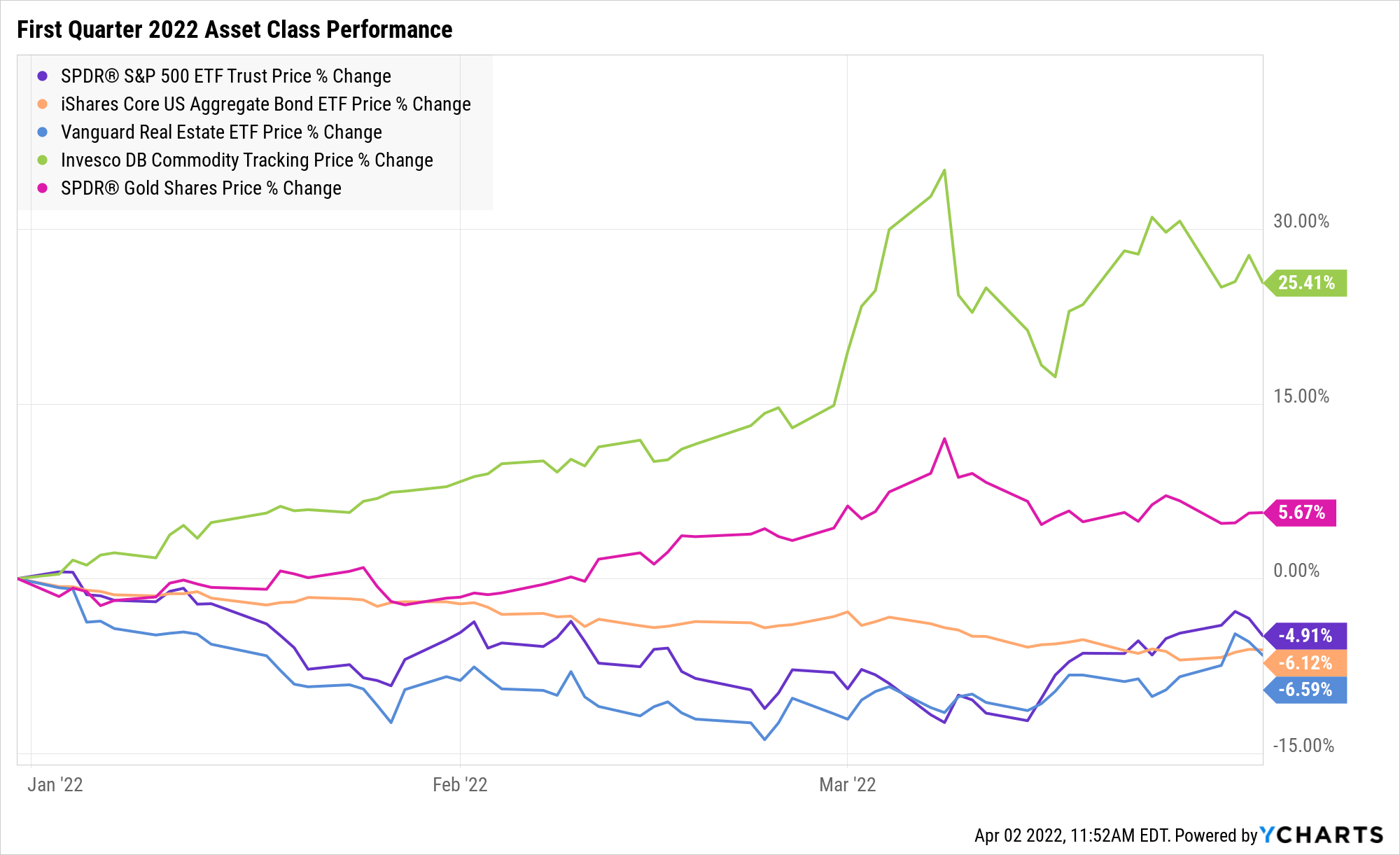 Unfortunately for fixed income investors, thanks to rising rates, bonds did not recover in March and actually finished the quarter lower than stocks as did the interest-rate-sensitive real estate sector. Commodities, driven by energy, soared 25% or so and gold gained almost 6% on inflation and war worries.