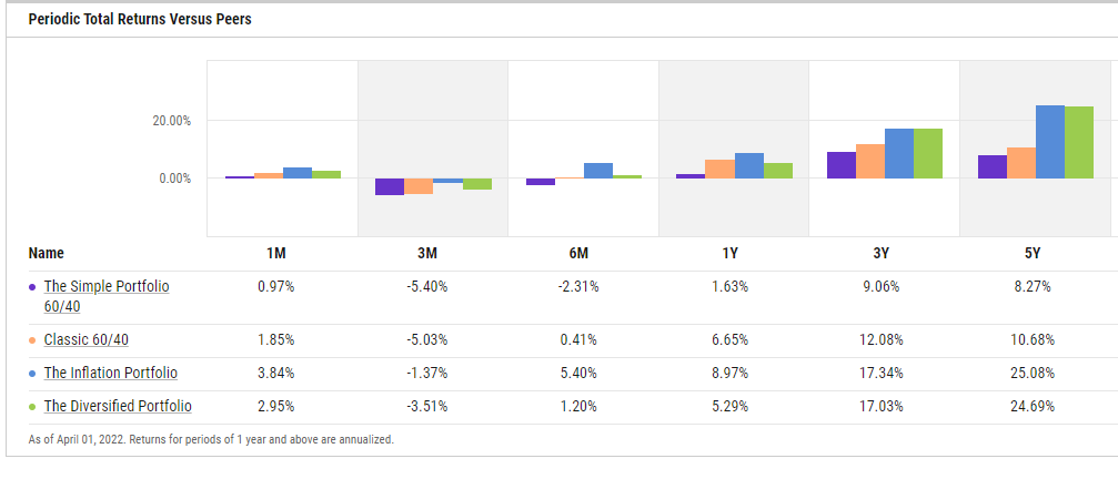 - The Inflation Portfolio is doing quite well so far this year. In fact, it is the best performing portfolio of the bunch for each period measured in the table above. This is probably due to its focus on dividend paying stocks, adjustable rate bonds (eg. TIPS), and exposure to gold and commodities.